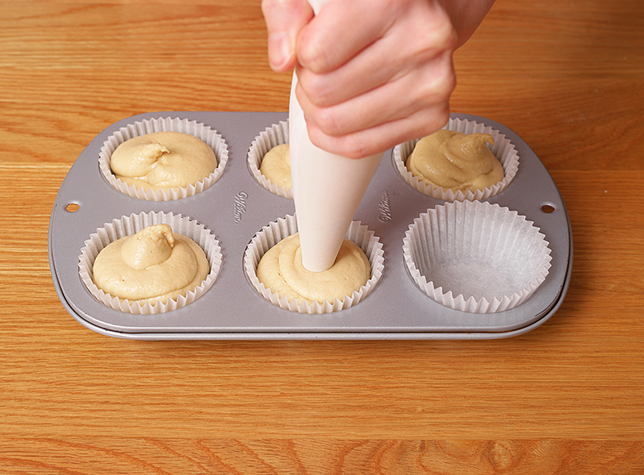 7. 머핀틀에 유산지를 깔고 스쿱 혹은 짤주머니를 이용해서 반죽을 짜줍니다.