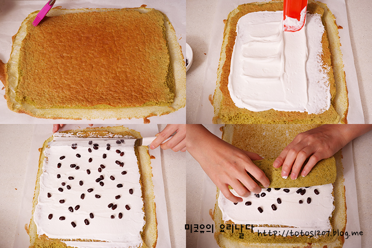 9. 식은 시트에 생크림을 바르고 그위로 팥배기를 적당히 올린 뒤 김밥 말듯이 돌돌 말아 주세요.