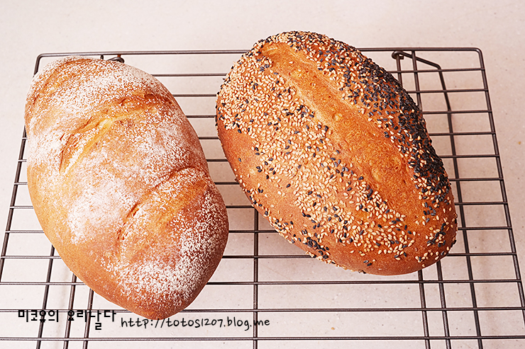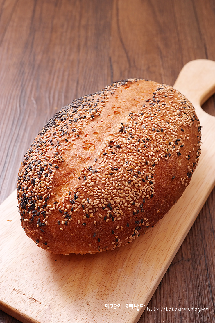 재료 : 프랑스밀가루 400g, 인스턴트드라이이스트 6g, 소금 7 ~8g, 꿀 30g, 물 230 ~ 240g, 토핑용 검은깨 + 통깨 적당량