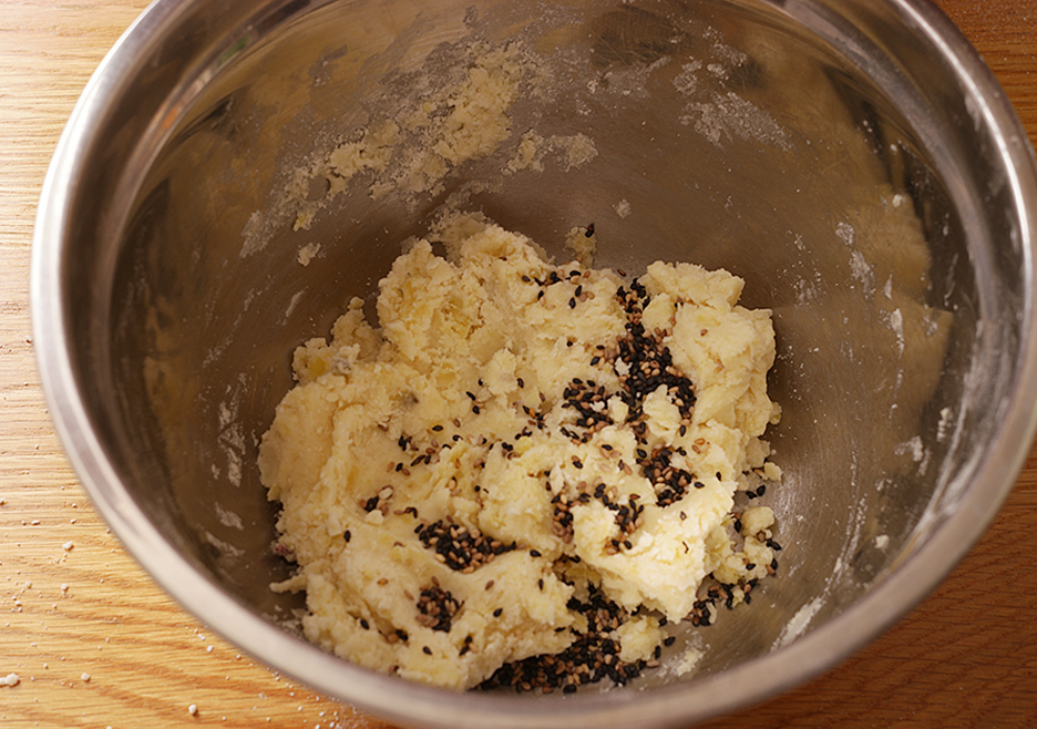 4. 마지막에 흑임자도 넣어서 한덩이로 만든 후 냉장실에서 30분 가량 휴지합니다.