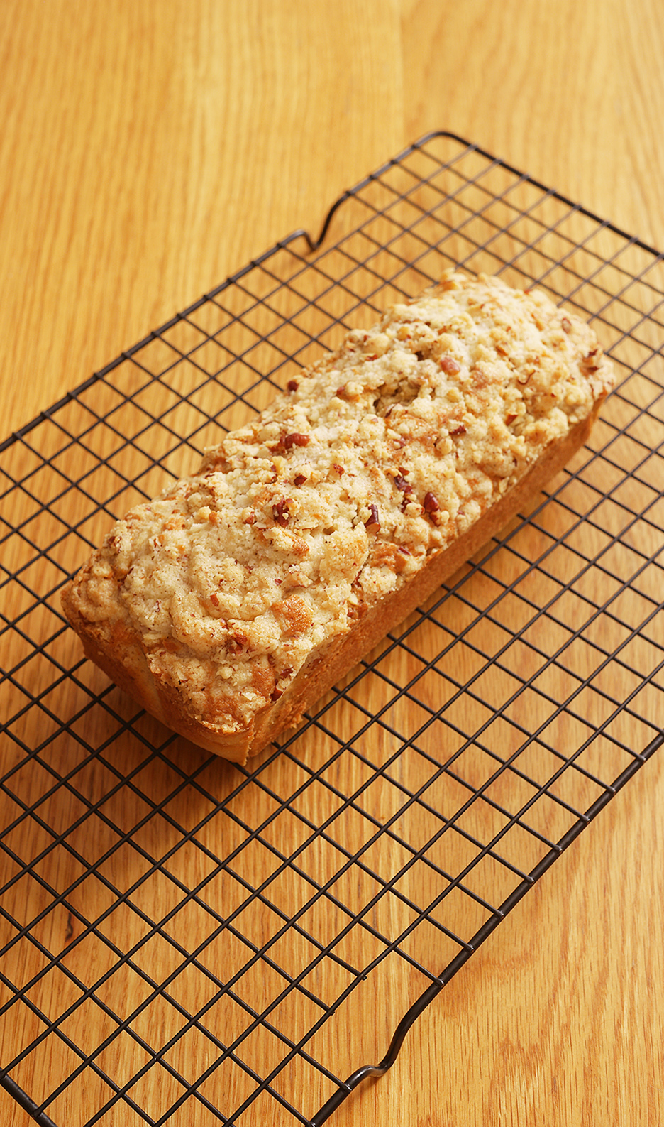 9. 파운드케이크 반죽 위에 갓 만든 크럼블을 올려 줍니다.