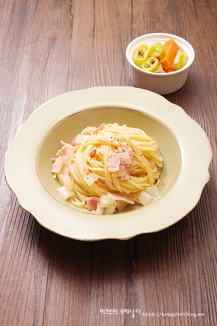 편으로 썬 마늘을 올리브유에 달달 볶고, 양파와 베이컨을 넣어 깔끔한 맛이 특징인 오일 파스타입니다.