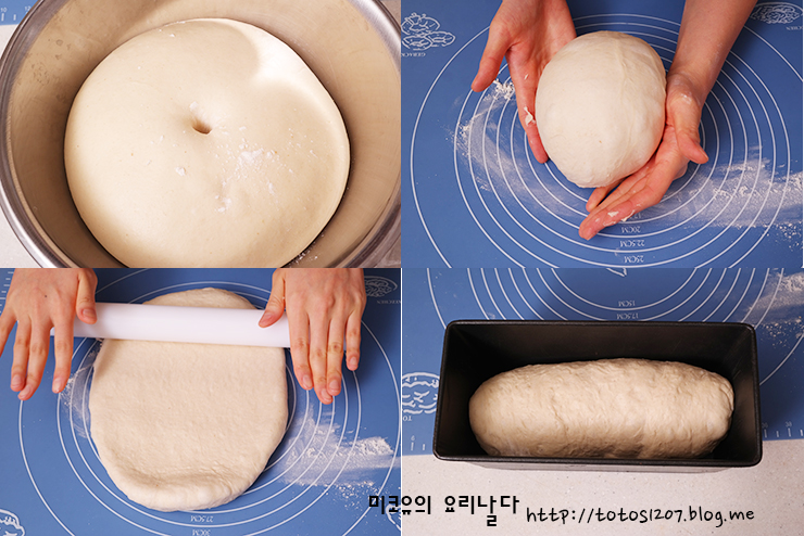 4. 중간발효 후 반죽을 밀대로 밀어 돌돌 말아 원루프 형식으로 성형하고, 옥수수 식빵 틀에 넣어 틀 높이까지 꽉 차오르도록 2차 발효합니다.