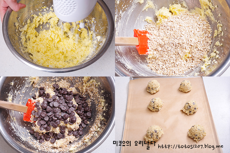 재료 : 박력분 130g, 버터 110g, 설탕 110 ~ 120g, 달걀 1개, 초코칩 150g, 오트밀 80g