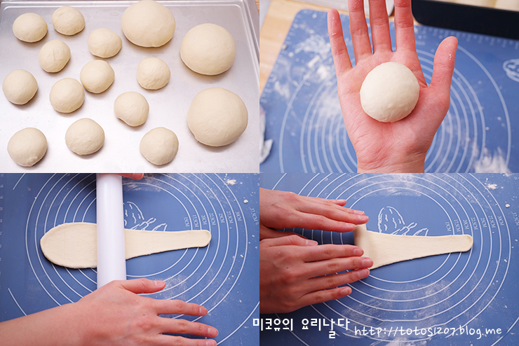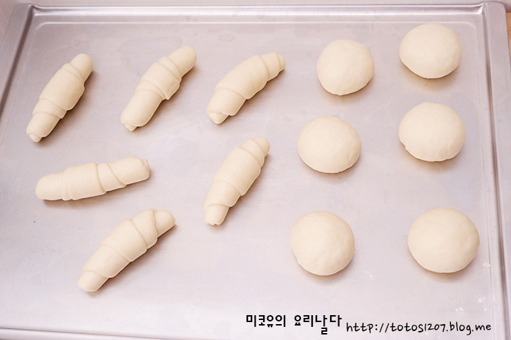 5. 다시 한번 가스를 빼고, 버터롤은 올챙이 모양으로 만들어 돌돌 말고, 모닝빵은 동글하게 성형합니다