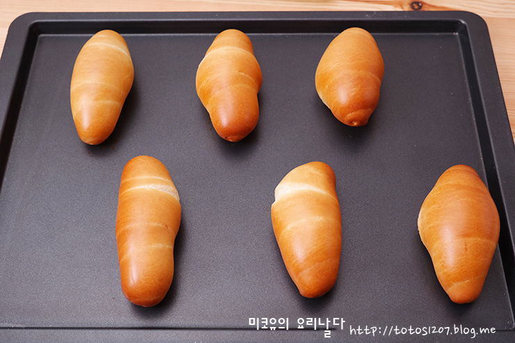 6. 2배 가까이 부풀도록 2차 발효 후 달걀물을 바르고 200도 예열된 오븐에서 약 10분 정도 구워주면 완성입니다.