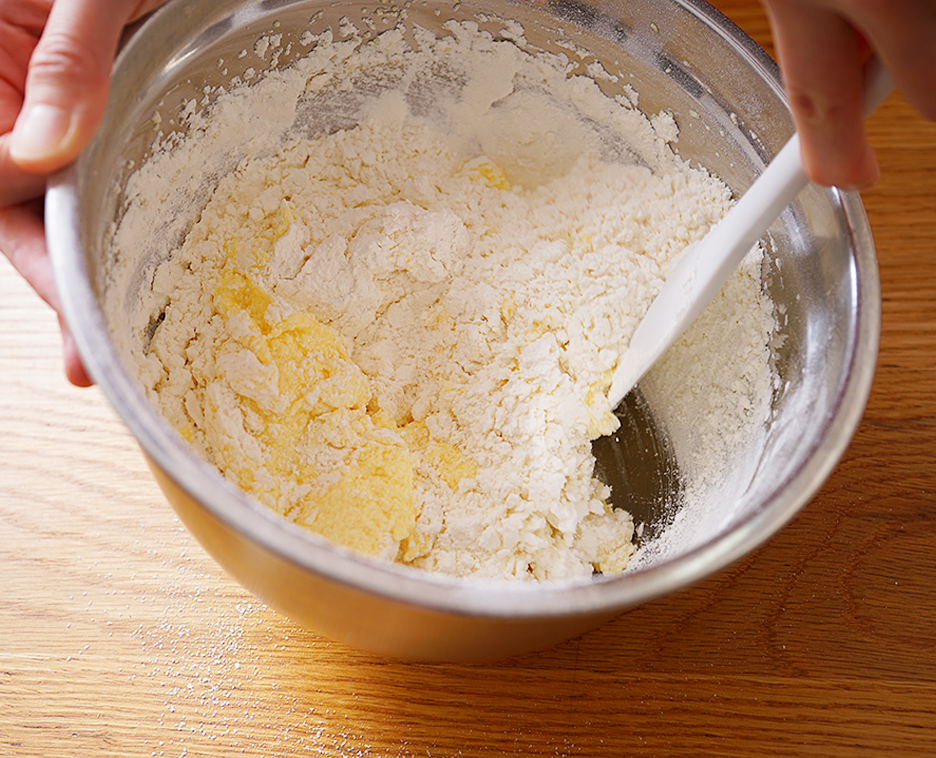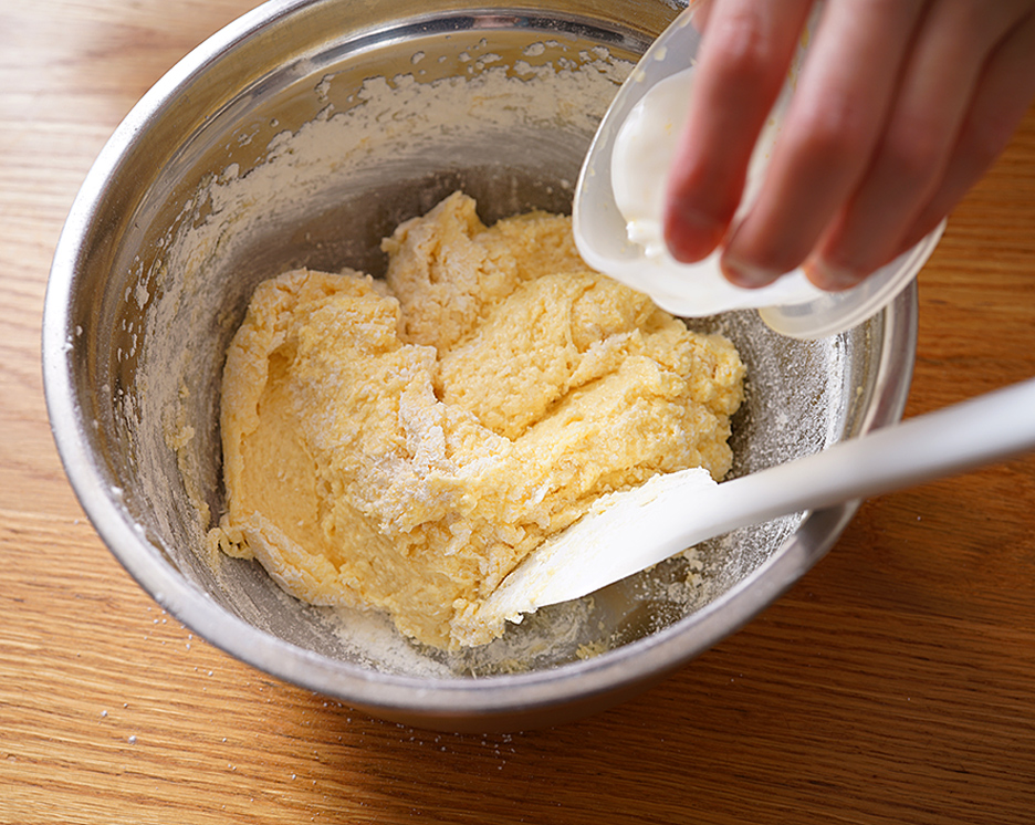 6. 날가루가 좀 남았을 때 생크림도 넣어 섞어 줍니다.