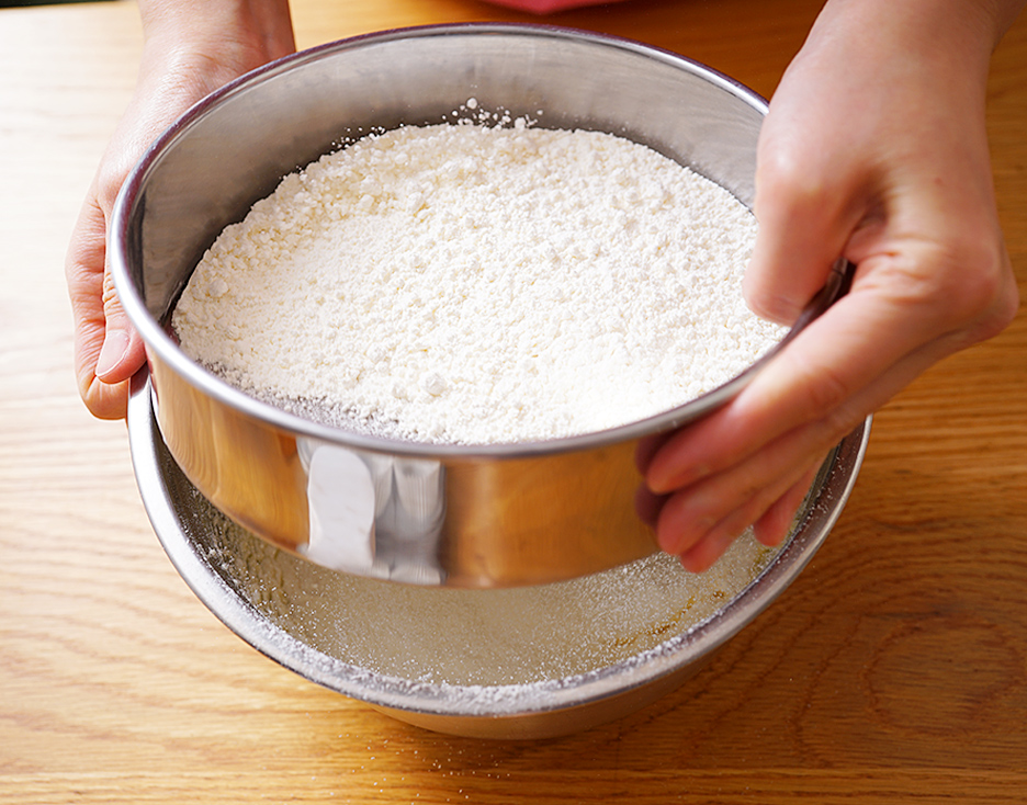 4. 박력분과 아몬드가루, 그리고 베이킹파우더를 체 쳐 넣어 줍니다.