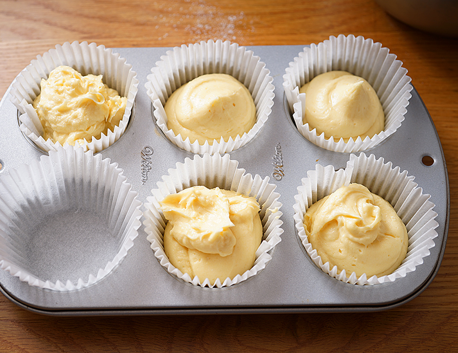 7. 머핀틀에 유산지를 깔고 반죽을 80% 정도 담아 주세요.