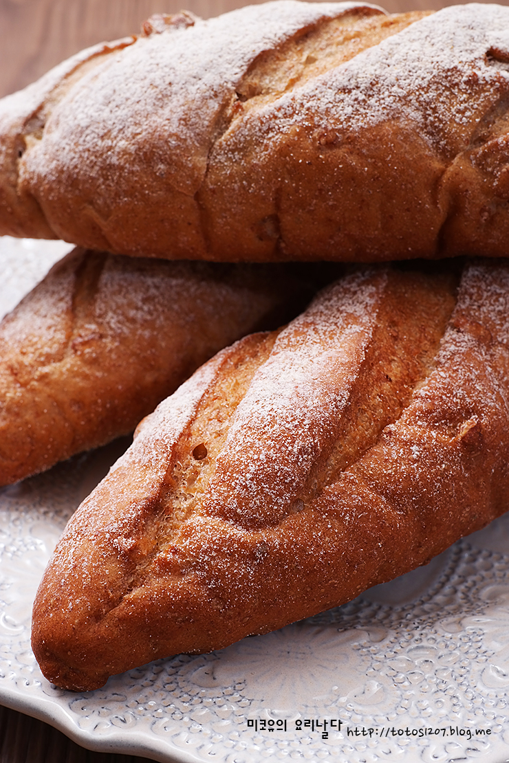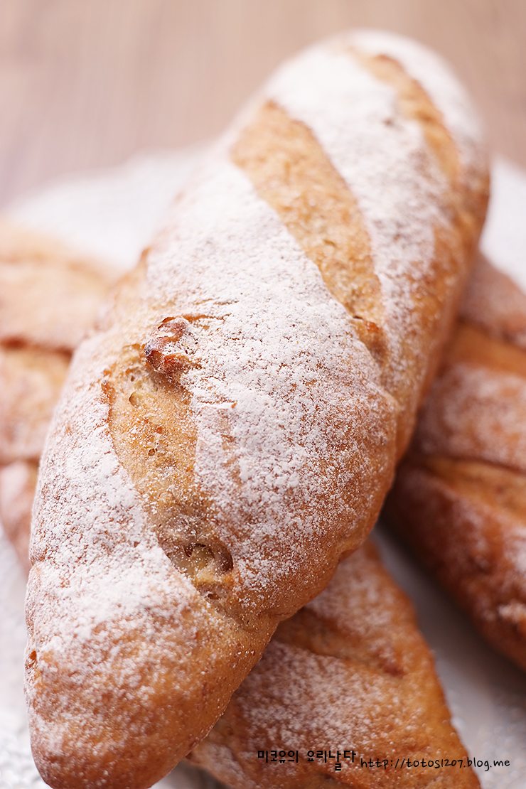 재료 : 프랑스밀가루 270g, 호밀가루 30g, 인스턴트드라이이스트 4g, 소금 4g, 설탕 13g, 버터 12g, 물 195g, 다진 호두 60g