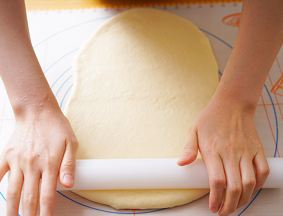 5. 반죽을 밀대로 밀어 주세요.