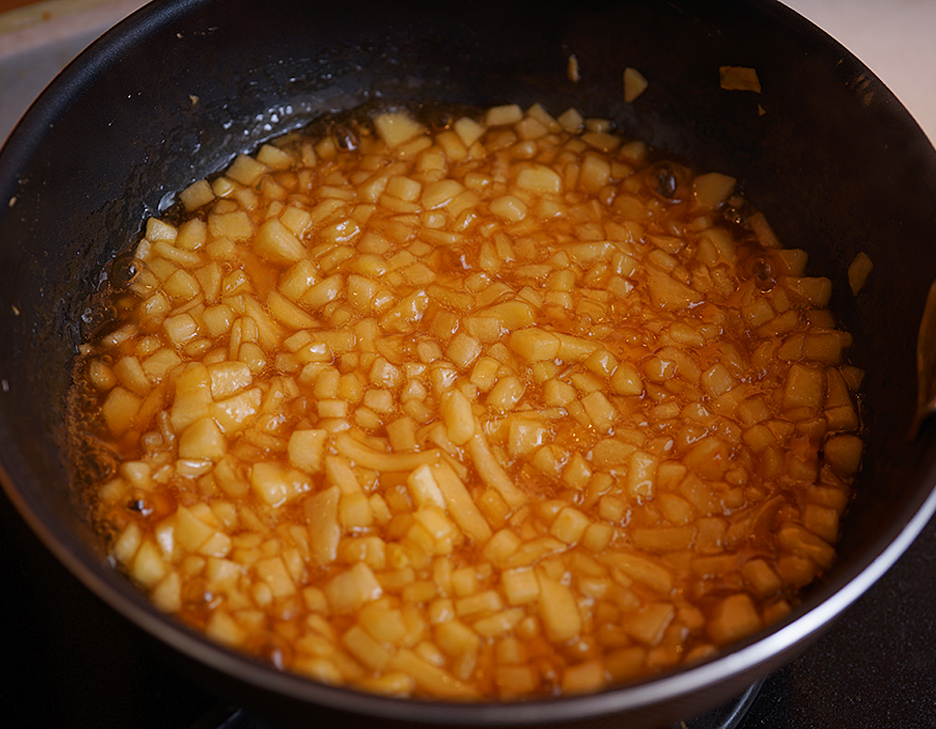 1. 먼저 사과필링을 만들기 위해서 팬에 껍질 벗겨서 잘게 다진 사과와 레몬즙을 제외한 나머지 재료도 넣습니다.
