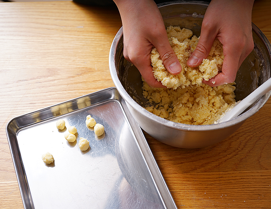 소보로 크럼블 : 버터 55g, 설탕 70g, 소금 1g, 달걀 12g, 박력분 90g, 베이킹파우더 1g