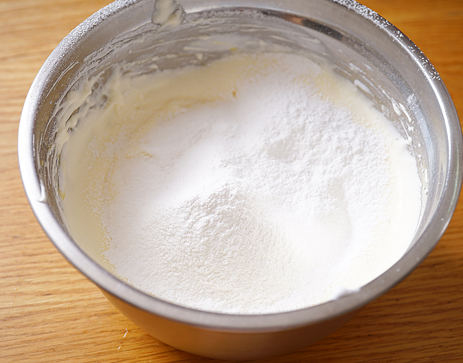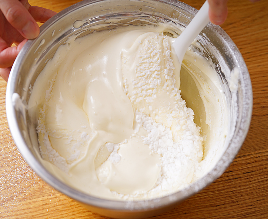 5. 박력 쌀가루를 체 쳐 넣습니다.