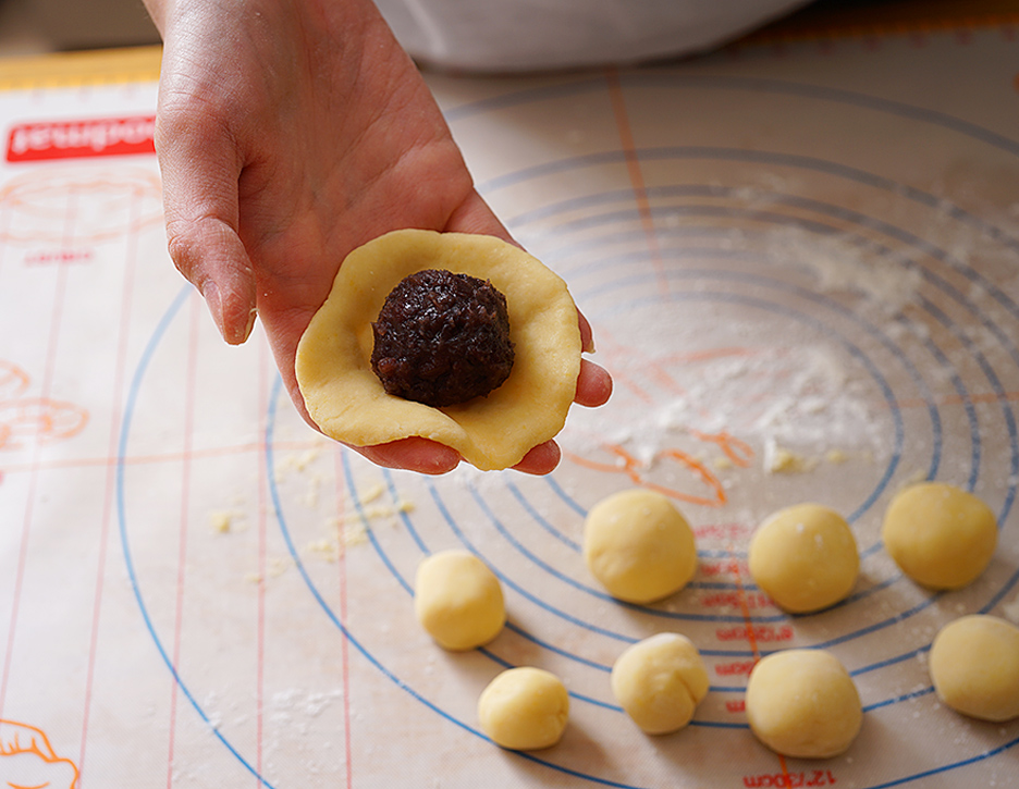6. 밀대로 민 밀가루 반죽에 앙금을 넣어 감싸거나 혹은 동그란 반죽 위에 앙금을 올려서