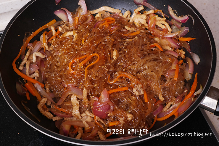 5. 1의 불려두었던 당면을 넣고 볶다가, 양념 투하합니다.