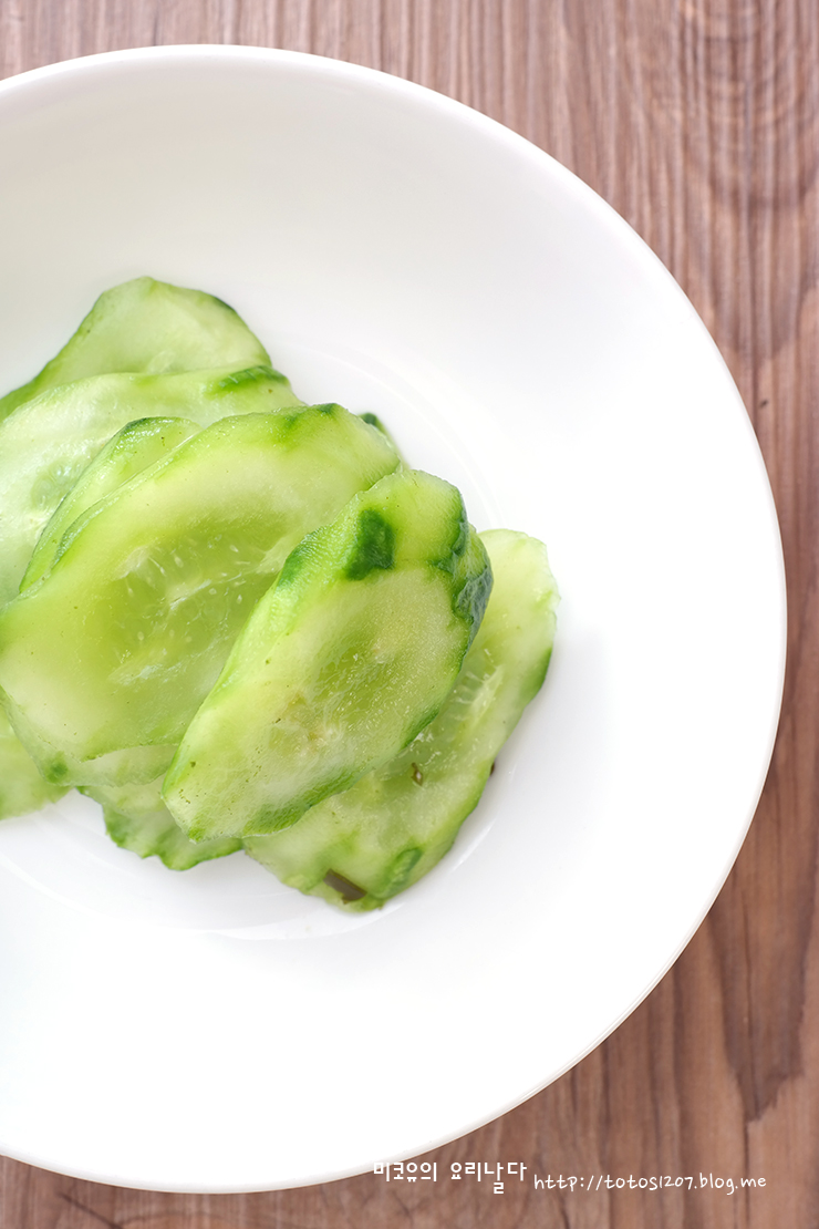 1. 오이는 껍질을 적당히 벗기고, 1cm 정도 두께로 어슷썰기 해주세요.