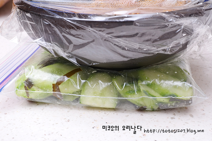 4. 공기를 빼고 무거운 그릇을 위에 올려 냉장고에 2시간 정도 넣어두면 완성입니다.