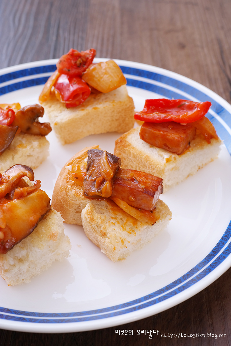 재료 : 식빵 ( 혹은 바게트 ), 스팸 작은것 1캔, 양파 1개, 새송이 버섯 1개, 파프리카 1개, 참기름 1큰술, 다진마늘 1/2큰술, 마요네즈,