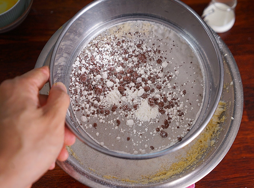 4. 박력분, 베이킹파우더, 코코아 가루를 체 쳐 넣어 주세요.