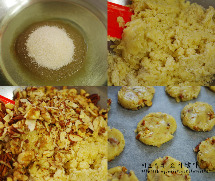재료 : 박력 쌀가루 200g, 포도씨유 92g, 달걀 1개, 각종 견과류 100g, 유기농 황설탕 40g, 유기농 흑설탕 50g, 바닐라엣센스약간