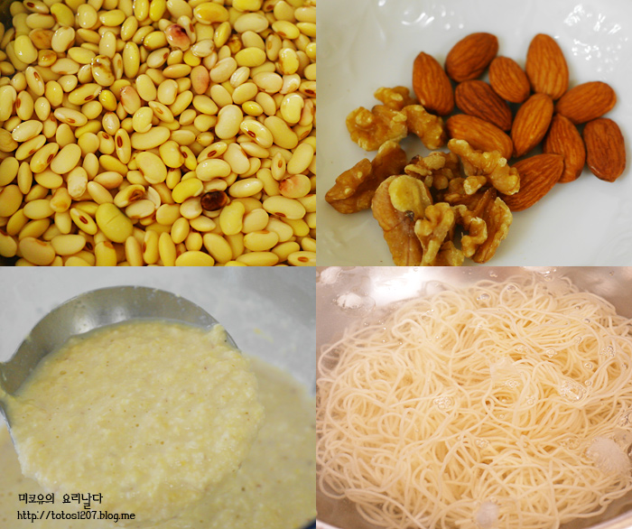 하루 전날 불려 놓았던 콩을 삶아 각종 견과류와 함께 곱게 갈아 콩국물을 만들구요.